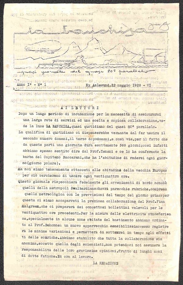 Spedizione Artica del Dirigibile Italia - 22 maggio 1928 - Giornale La Banchisa (Longhi 1798 - 280Li) - esemplare numero 1 del giornale di bordo ciclostilato su quattro facciate - splendido in perfetto stato di conservazione - molto raro - Longhi