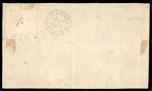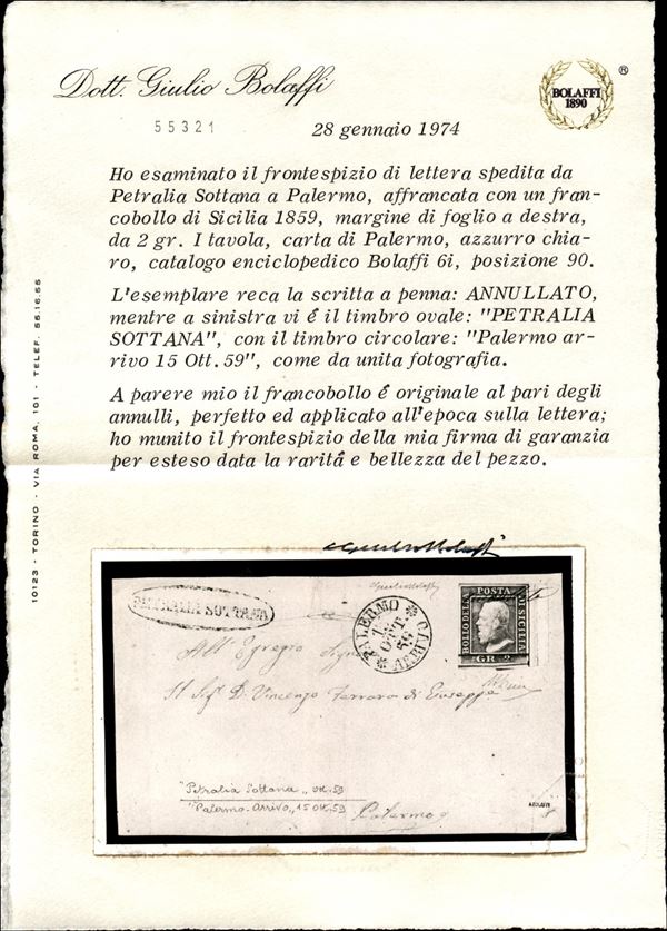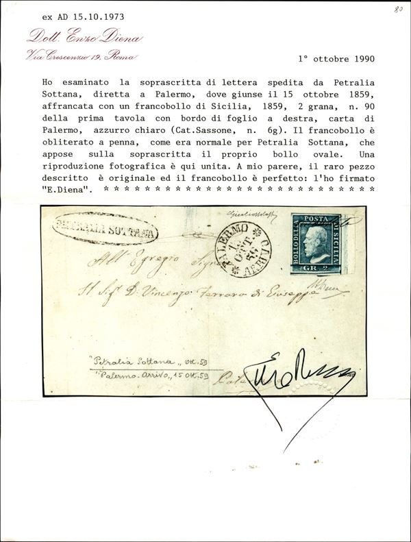 Splendido esemplare del 2 grana azzurro chiaro (6g) I Tavola Pos. 90 con bordo di foglio a destra su frontespizio da Petralia Sottana (ovale + "annullato" a penna - P.ti R2) a Palermo del 15.10.59 - oggetto di grande rarità e bellezza - A. Diena + cert. G. Bolaffi + cert, E. Diena