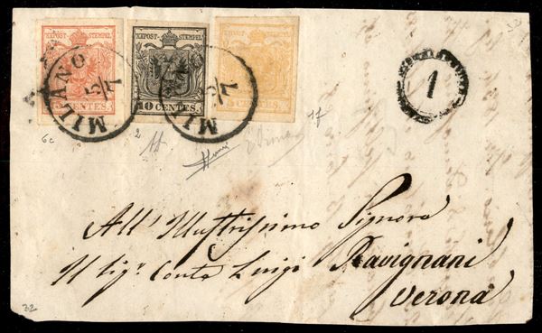 Tricolore - 15 cent (6) + 10 cent (2) + 5 cent (1f) - intero frontespizio di lettera da Milano a Verona - Emilio Diena + S. Sorani + cert. A. Diena