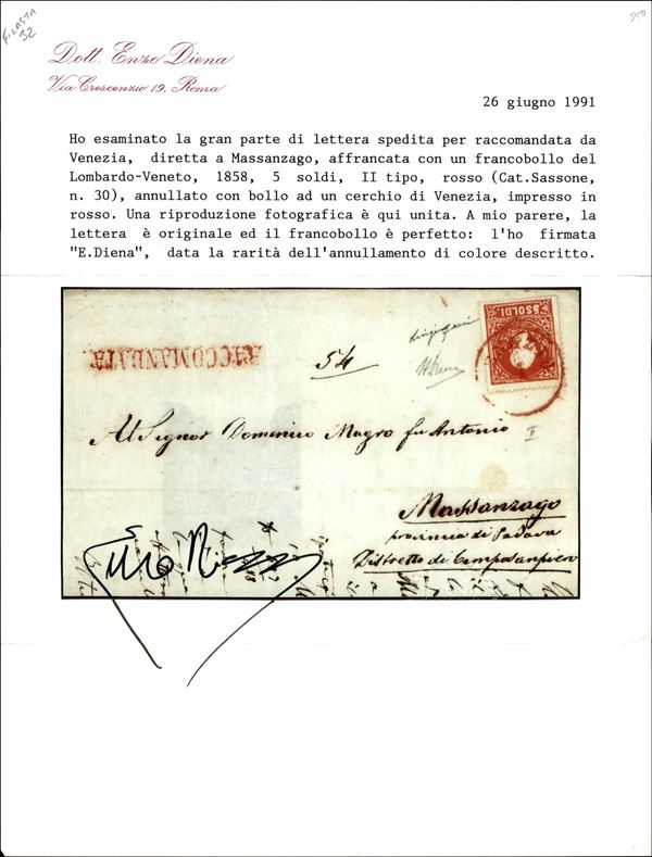 VENEZIA - C1 rosso (Pti R1) - Gran parte di lettera raccomandata con s.5 rosso II tipo (30) annullato col pregevole bollo C1 in rosso - Diena segnala unicamente tre impronte note - Gazzi + A.Diena + Cert. E.Diena