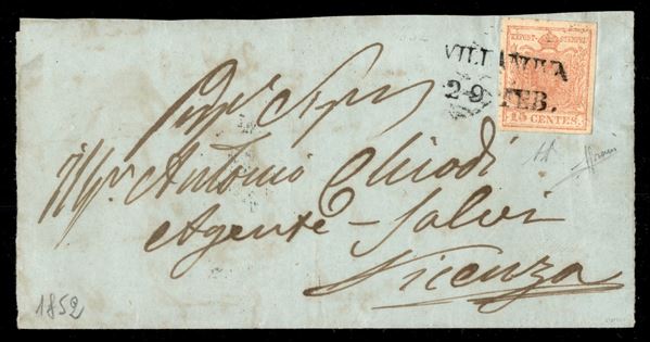 Villanova (stampatello dritto - P.ti 10) - lettera del 29.2.1852 per Vicenza affrancata con 15 cent secondo tipo (30) - firma Sorani + cert. A. Diena