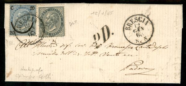 Lettera per i territori Austriaci con 5 cent + 20/15 cent III tipo (L16 + 25) da Brescia 12 gen. 65 per Padova con bollo PD