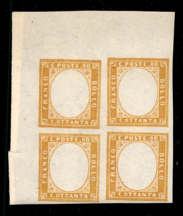 1862 - Blocco di quattro esemplari c.80 arancio carico angolo di foglio in alto a sinistra con gomma integra, non ultimato in quanto privo di effigie, firma M.Catania
