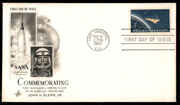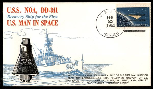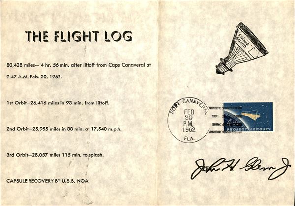 1962 - Primo Uomo nello Spazio - due buste del progetto Mercury una della partenza Cape Canaveral 20.2.62 e una del rientro e recupero per opera della USS NOA il 23.2.62 pił il Flight Log della missione con firma autografa dell'astronauta J. Glenn - insieme molto bello