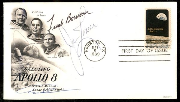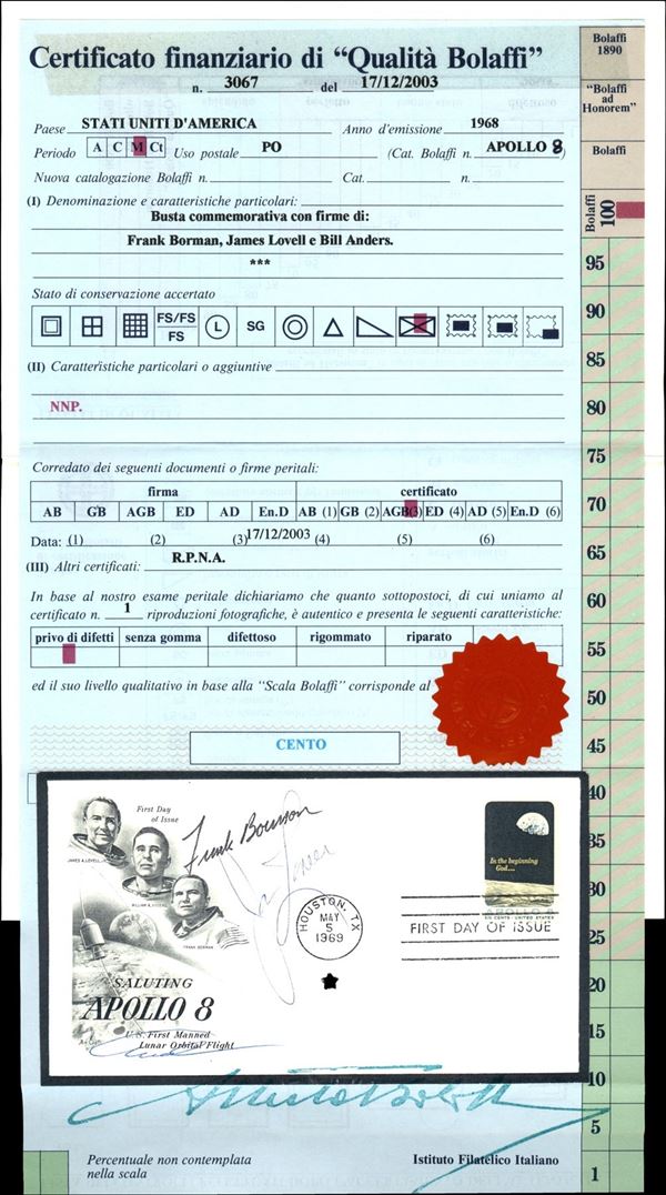 1969 - Busta raccomandata Apollo 8 con firme autografe degli astronauti F. Borman J. Lovell e B. Anders - annullo Huston TX 5.5.69 - molto bella - cert. finanziario Bolaffi 100%