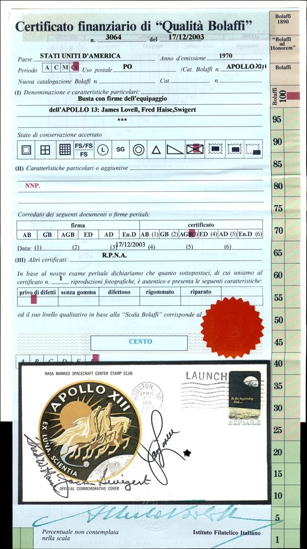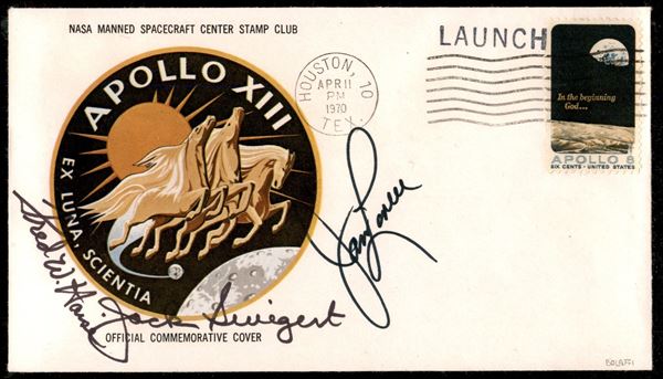 1970 - Busta commemorativa Apollo XIII con firme autografe degli astronauti J. Lovell F. Haise e J. Swigert annullata Huston 11.4.70 - molto bella - cert. finanziario Bolaffi 100%