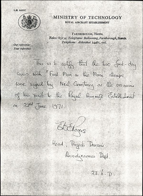 1971 - Busta annullata Moon Landing 20.7.69 e Washington DC 9.9.69 con firma autografa dell'astronauta N. Amstrong apposta in occasione della visita presso il Royal Aircraft Establishment del 22.6.71 - una delle due buste conosciute come da copia del documento allegato - molto bella e rara