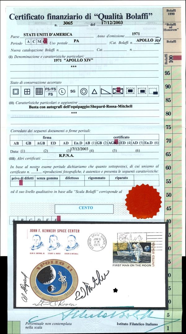 1971 - Busta commemorativa Apollo XIV con firme autografe degli astronauti Shepard Roosa e Mitchell annullata Kennedy Space Center 31.1.71 - molto bella - cert. finanziario Bolaffi 100%