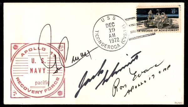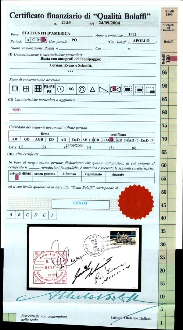 1972 - Apollo 17 - ultima missione con equipaggio del programma Apollo - busta commemorativa dell'ammaraggio annullata a Ticonderoga 19.12.72 e firme autografe degli astronauti G. Cernan R. Evans e H. Schmitt + cert. finanziario Bolaffi 100%