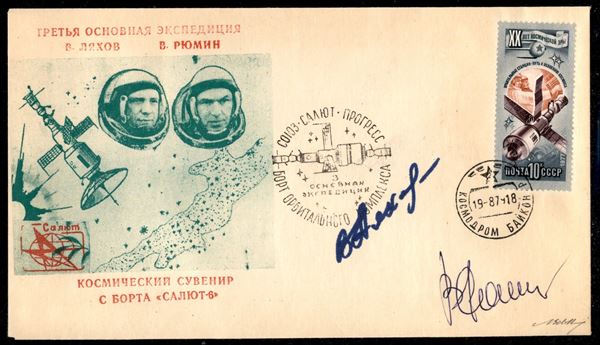 1979 - Salyut 6 - cosmogramma partito il 25.2.79 con la Soyuz 32 e rientrato il 19.8.79 con la Soyuz 34 - firme autografe degli astronauti Lyakhov e Ryumin - molto bella e di ottima qualità - Bolaffi