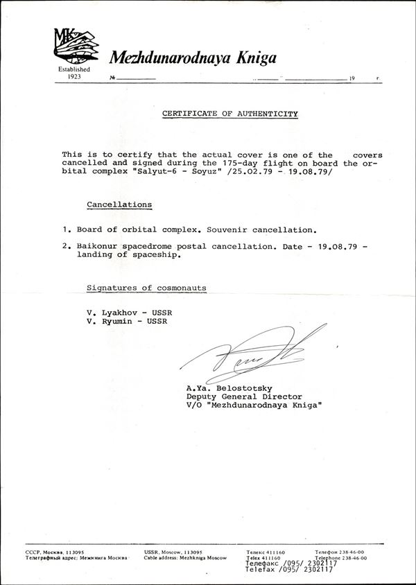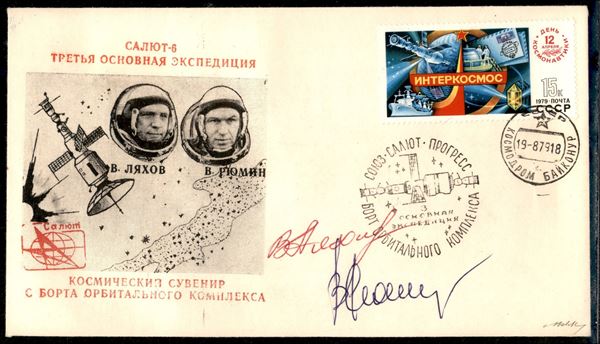 1979 - stazione orbitale Salyut-6 - Soyuz 32/34 - cosmogramma del volo Soyuz 32/34 (25.2.-19.8.1979) timbrato a bordo della Salyut-6 durante la permanenza di 175 giorni dell'equipaggio con "Bordo del complesso orbitale Soyuz-Salyut-Progress" e annullo Cosmodromo di Baikonur del 19.8.1979, giorno dell'atterraggio della navicella Soyuz 34 - firme autografe dell'equipaggio, V.Ryumin e L.Lyakhov – molto bella e di ottima qualità - Bolaffi + cert. Kniga