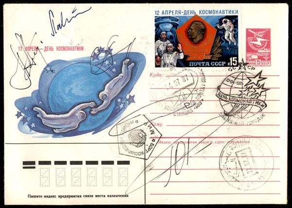 1987 - Stazione orbitale Mir - Soyuz TM-3 - cosmogramma del volo sovietico-siriano Soyuz TM-3 - bollo pentagonale nero di bordo Mir, annullo ufficiale "Siria 22.07.87", lancio, e sovietico-siriano "CC*CP 24.07.87", commemorativo dell'aggancio Mir e del carattere internazionale del volo sovietico-siriano - firme autografe di Y.Romanenko e A.Laveikin (Soyuz TM-2 a bordo della stazione), A.Viktorenko, A.Alexandrov e M.Faris, Siria (Soyuz TM-3) – ottima qualità - cert. Kniga