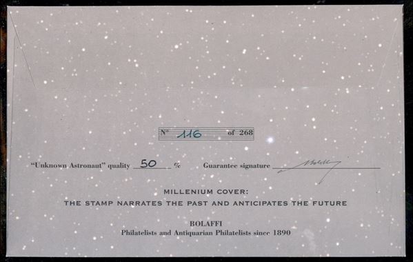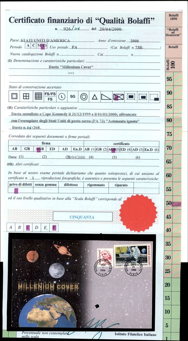 1999/2000 - Millenium Cover - busta affrancata con 10 cent Astronauta Ignoto + 56 cent annullato Kennedy Space Center Fl. del 31.12.1999 e del 1.1.2000 in occasione del passaggio del millennio - busta 116 di 268 - cert. finanziario Bolaffi 50%