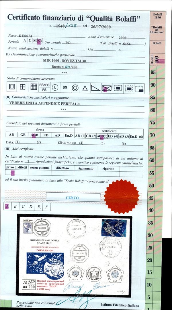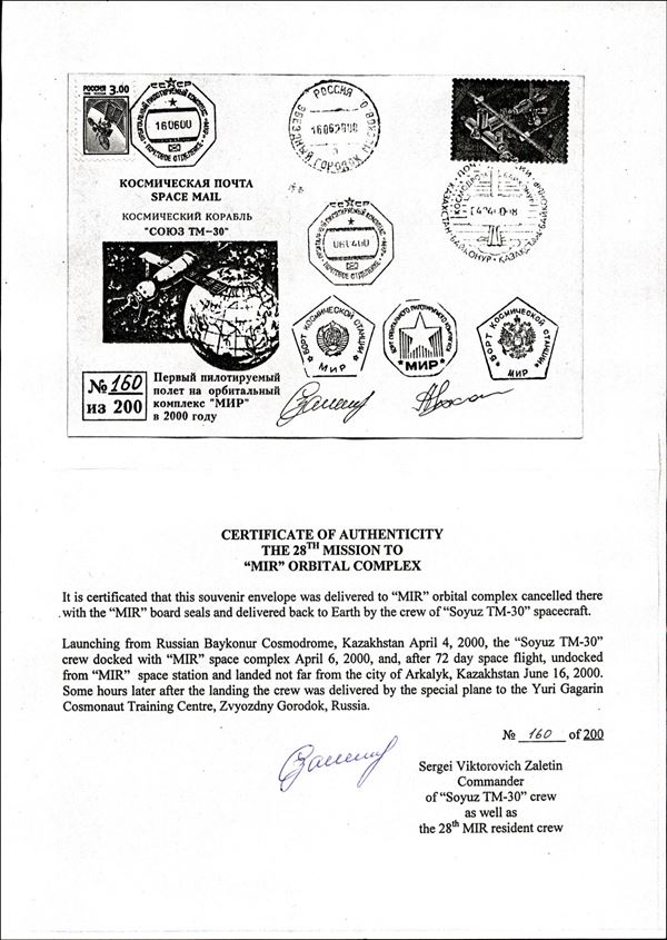 2000 - Stazione orbitale Mir - Soyuz TM-30 - Mir "2000", il primo cosmogramma del nuovo millennio in folder commemorativo - busta n.160 di 200 trasportata a bordo Mir dalla Soyuz TM- 30 - ann. di partenza dal Cosmodromo di Baikonur del 4.4.2000; ann. ottagonale "CC*CP 06.04.00", aggancio Soyuz TM-30/Mir; timbri di bordo neri, entrambi i bolli pentagonali e l'ottagonale stellare - al verso foglietto con citazione del pioniere russo Tsiolkovsky + annullo ottagonale stellare di bordo Mir - firme autografe dei cosmonauti Zaletin e Kalery - cert di autenticità del comandante Zaletin + cert. Finanziario Bolaffi 100%
