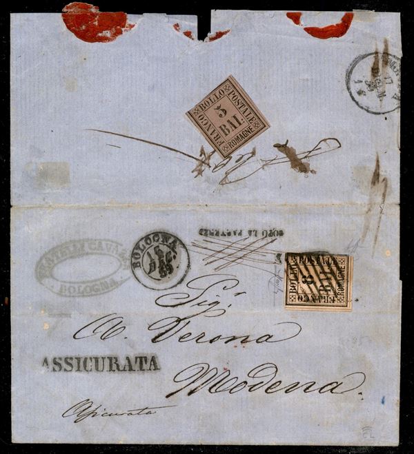 Assicurata affrancata con 8 bai rosa (8) pił un 5 bai violetto al retro (6) non annullato - lettera da Bologna a Modena del 16.12.59 - 8 bai stretto a desta e 5 bai corto in alto - A. Diena + cert. Raybaudi