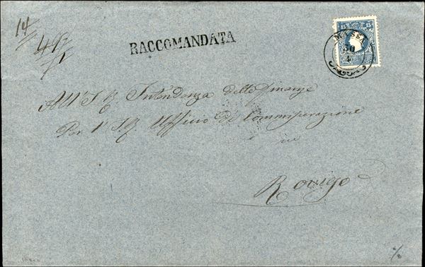 Bellissima busta raccomandata da Massa affrancata con 15 cent pił al verso 10 soldi (32 + 31) ben dentellati