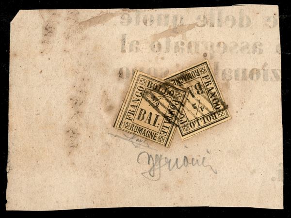 Due 1/2 bai giallo paglia (1) usati sovrapposti su piccolo frammento di manifesto - Grioni + Raybaudi