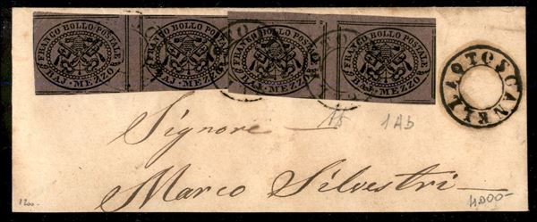 Due coppie orizzontali con interspazio di gruppo del 1/2 baj violetto cupo (1Ab) su grande frammento di lettera da Toscanella (circolare senza data) - margini completi - cert. A. Diena