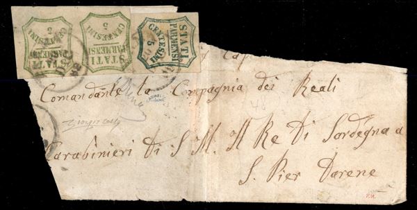 Grande frammento di lettera affrancata con coppia del 5 cent verde giallo (13) in combinazione con il 5 cent verde azzurro (12) tutti ben marginati da Parma a S. Pier d'Arena del 20.12.59 - trattasi dell'unico documento postale noto con questa combinazione di valori gemelli - ex collezione Achillito Chiesa - ED + cert. Colla