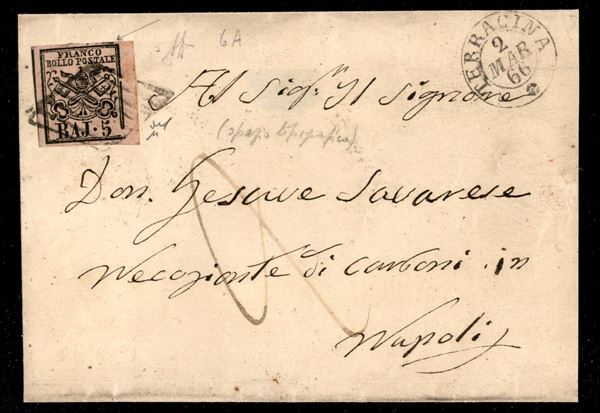Lettera con b.5 rosa (6) con varietà di stampa sul lato destro e presenza dello spazio tipografico in alto, da TERRACINA 2 MAR.66 per Napoli, inconsueta varietà