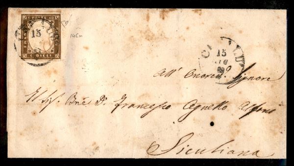 Lettera con c.10 bistro oliva scuro (14Da) da CEFALU 15 LUG.62 per Siculiana, tariffa ridotta all'interno della Sicilia, colore molto intenso del 10 centesimi, macchie di ruggine, firma E.D.