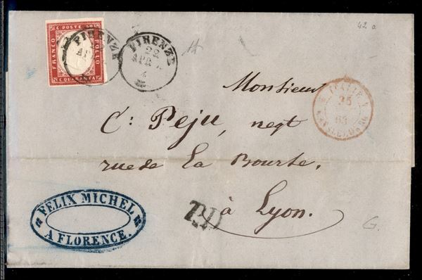 Lettera con c.40 rosa carminio scuro (16E) da FIRENZE 22 APR.63 per Lione, fresca e splendida, firma A.D.
