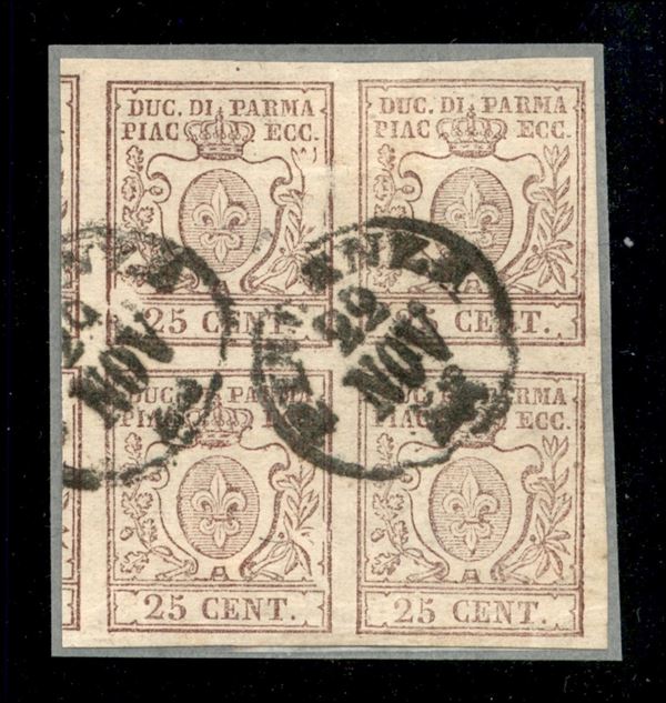 Quartina del 25 cent bruno lilla (10) annullata Piacenza 22.11.58 - unico blocco di quattro annullato conosciuto per il Ducato di Parma - grande rarità - splendida - cert. ED
