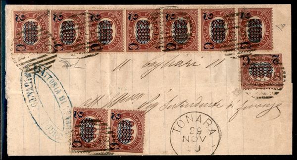 Striscia di sette + coppia + singolo del 2 cent su 2 lire lacca scuro (34) su piego in tariffa da Tonara a Cagliari del 29.11.80 - tutti perfetti ad eccezione dell'esemplare singolo che presenta una leggera piega - ED + cert. Bottacchi